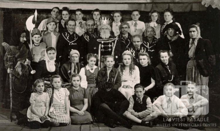 Gaujas 31. skautu un Gaujas 35. gaidu vienības dalībnieki Annas Brigaderes lugas "Sprīdītis" iestudējumā Antverpes nometnē Flensburgā (angļu zonā). Jaunieši ir ģērbušies kostīmos, fonā ir skatuves dekorācijas.