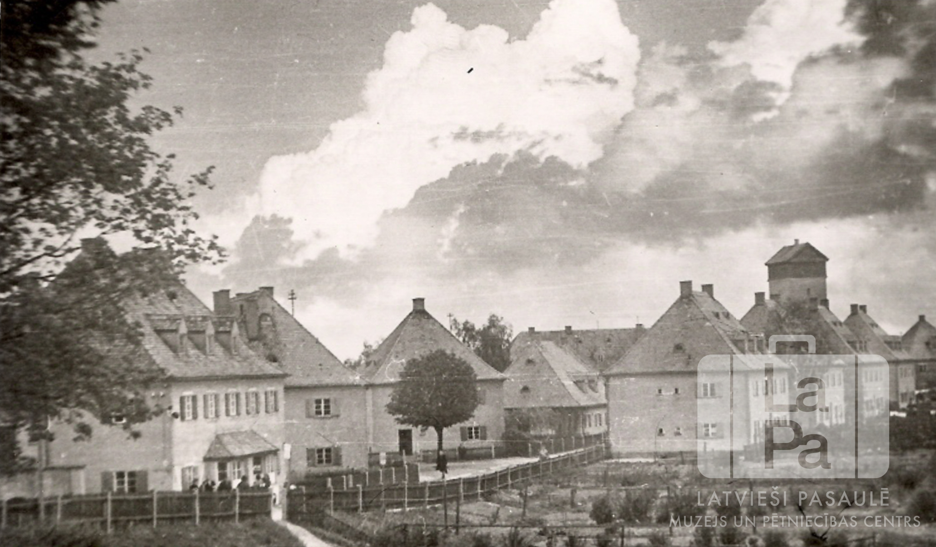 Skats Mīldorfas nometnē (amerikāņu zonā) ap 1947. gadu. Divstāvu mājas ar dārzu priekšā.