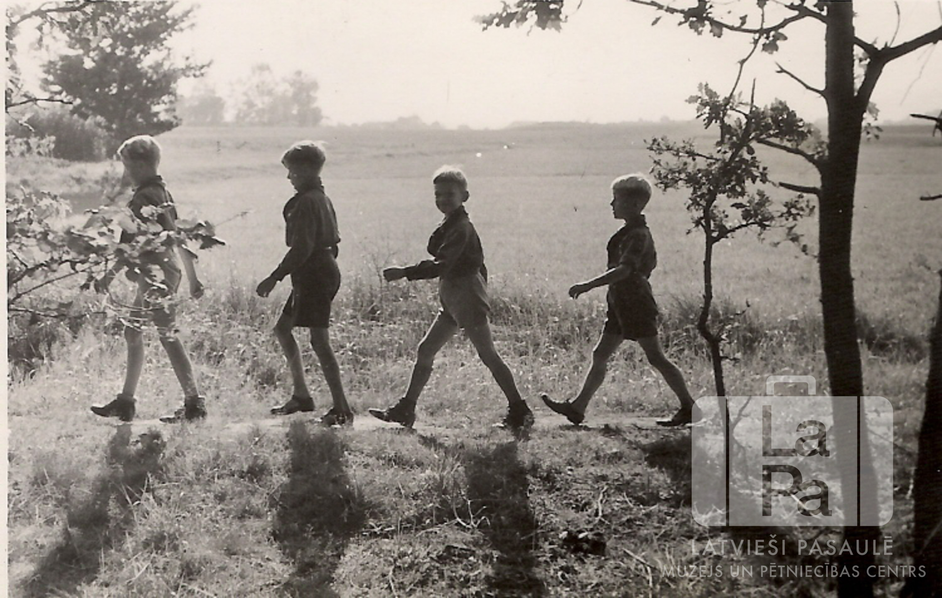 Četri mazskauti soļo rindā viens aiz otra pļavas malā pie Mīldorfas (amerikāņu zonā). Priekšplānā koki. No kreisās: Andris Zommers, Janis Subris, Juris Zommers, Verners Skuja.