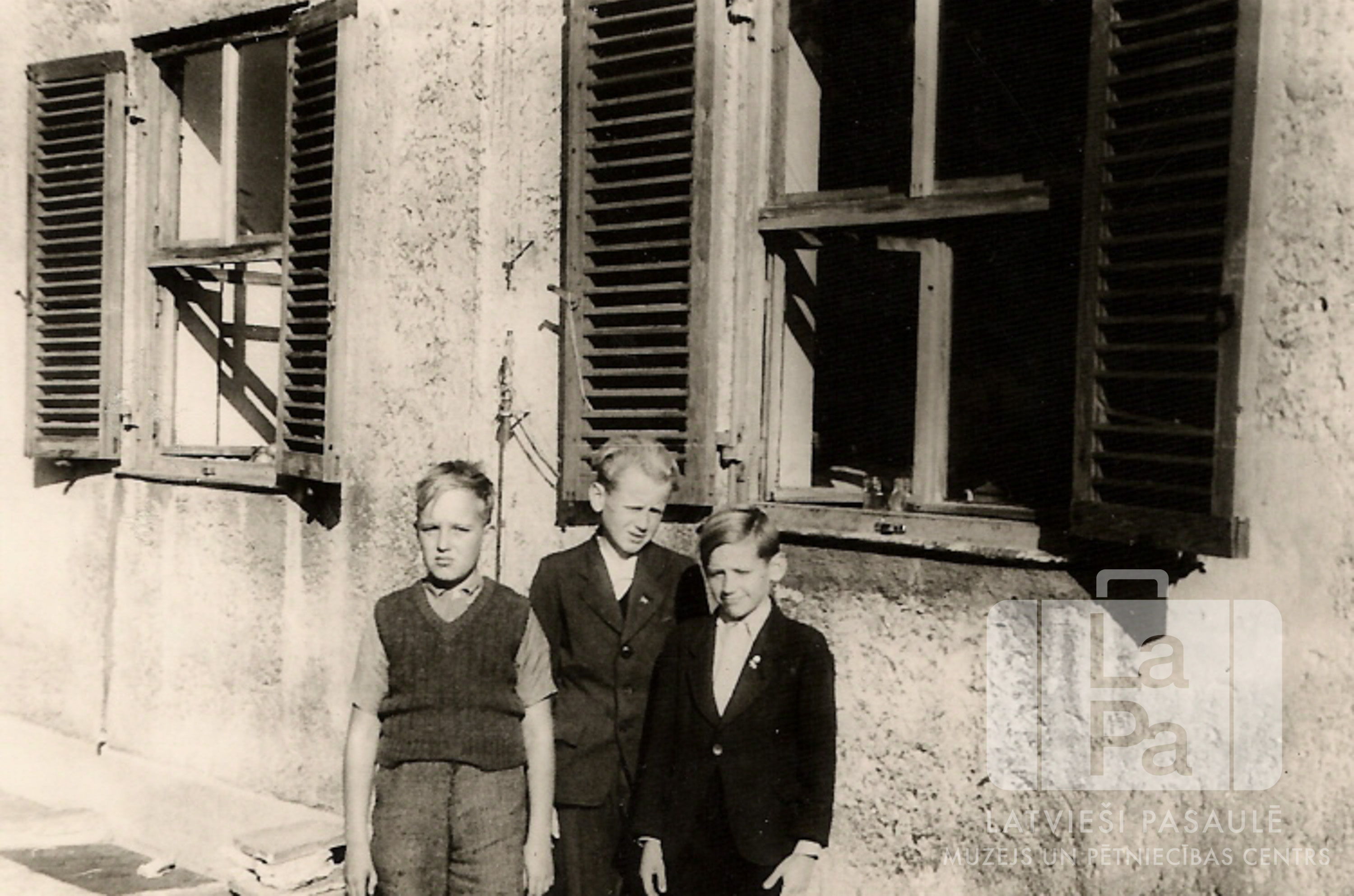 Trīs brālēni pie Zommeru ģimenes istabas loga ēkas aizmugurē Mīldorfas nometnē (amerikāņu zonā). Fonā divi logi ar slēģiem. No kreisās: Ivars Zommers, Andris Zommers, Juris Zommers. Foto autors: Jānis Skuja vai Pēteris Skuja.