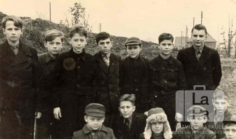 Daugmales 51. skautu vienības zēni Lohengrīnas nometnē Minhenē (amerikāņu zonā). Fonā neliela nogāze un tālumā vairākas mūra ēkas. Priekšā, no kreisās: J. Ozols, J. Strautiņš, G. Samsons, L. Klavsons, D. Bitmanis un V. Kleinbergs. Aizmugurē stāv, no kreisās: J. Grigalis, I. Ozols, A. Gailis, K. Veldze, Z. Grigalis, E. Ārītis un I. Jirgens.