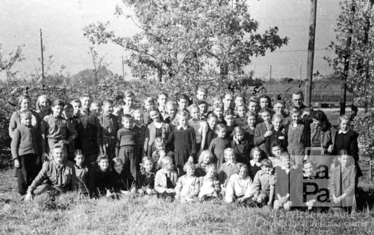 Skauti un gaidas no Daugmales 51. skautu vienības un Daugmales 22. gaidu vienības Lohengrīnas nometnē Minhenē (amerikāņu zonā) neilgi pēc vienību izveidošanas 1945. gada rudenī. Priekšējā rinda sēž zālē, pārējās stāv kājās. Fonā koki. Aizmugurē stāv, no labās: pirmais Magnus Ezeriņš (vadītājs, pie staba), otrais Kārlis Stunda, ceturtā M. Labsvīra. Foto autors: K. Viburs.