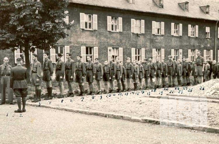 Latviešu skauti ierindā atstāj karoga laukumu Lohengrīnas nometnē Minhenē (amerikāņu zonā) Otrā pasaules kara beigu gadadienā pēc Latvijas valsts karoga pacelšanas. Ceremonijā piedalījās Daugmales 51. skautu vienība, Daugmales 22. gaidu vienība, lietuviešu un igauņu skauti un gaidas, Lohengrīnas nometnes administrācija un policija. Fonā divstāvu mūra ēka. Priekšplānā, kreisajā pusē zēnu ierindai priekšā stāv: Kārlis Stunda (vadītājs, pagriezies ar muguru). Labajā pusē priekšā zēnu ierindai stāv: Magnus Ezeriņš (vadītājs).