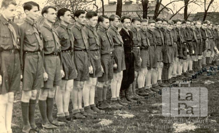 Daugmales 51. skautu vienības skauti formastērpos stāv ierindā Lohengrīnas nometnē Minhenē (amerikāņu zonā) 1946. gada pavasarī. Fonā, labajā pusē, redzamas vairākas mūra ēkas. No kreisās (pirmie 20 cilvēki): V. Rauda, U. Cīrulis, A. Richters, F. Veldze, G. Andersons, G. Veits, I. Jirgens, J. Grigalis, B. Mikēvičs, Z. Jirgens, G. Knēgers, I. Ozols, G. Bundža, A. Gailis, M. Vējiņš, K. Veldze, J. Ozols, E. Ārītis, L. Puriņš, Z. Grigalis.