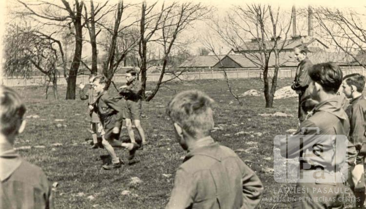 Daugmales 51. skautu vienības skauti veiklības nodarbībās Lohengrīnas nometnē Minhenē (amerikāņu zonā) 1946. gada pavasarī. Viens zēns skrien, pārējie kopā ar vadītāju noskatās. Visi skauti ir formastērpos. Fonā koki bez lapām, žogs un vairākas ēkas.