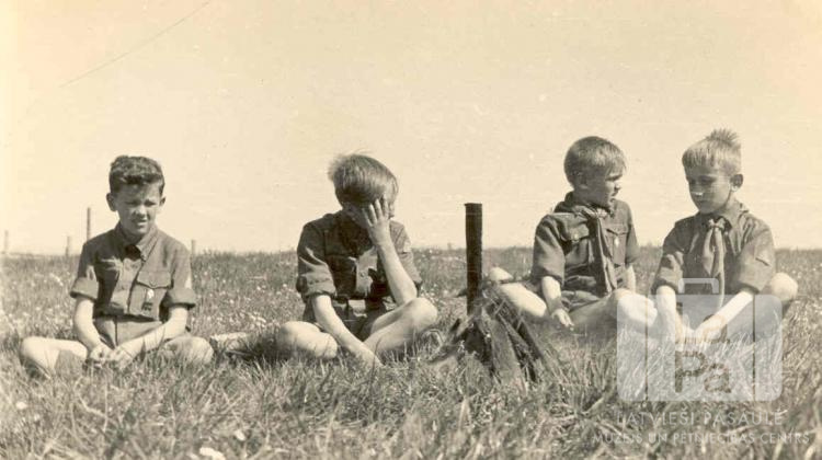 Mazskautu pulciņa zēni formastērpos sēž pļavā nodarbību laikā Lohengrīnas nometnē Minhenē (amerikāņu zonā) 1946. gada vasarā. No kreisās: L. Krūmiņš, L. Klavsons, K. Dakers un B. Irša.