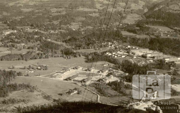 Skats no augšas uz Insulas nometnes ēkām Berhtesgādenē (amerikāņu zonā). Attēls ir uzņemts no Struba (?) virsotnes, redzamas trīs pacēlāja troses. Ainava ar laukiem un mežiem.