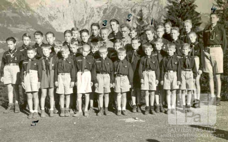 Litenes 99. skautu vienība no Insulas nometnes Berhtesgādenē (amerikāņu zonā) ar vadītājiem. Visi ir ģērbušies formastērpos. Fonā, labajā pusē, ir vairākas egles. Tālumā ir kalnu grēda. Aizmugurē stāv vadītāji (ar numuriem): pirmā M. Virse (mazskautu pulciņa vecākā), otrais Kārlis Stunda (Sidrabenes novada priekšnieks), trešais V. Virsis (vienības priekšnieks), ceturtais Dž. Apsīte (rovers).