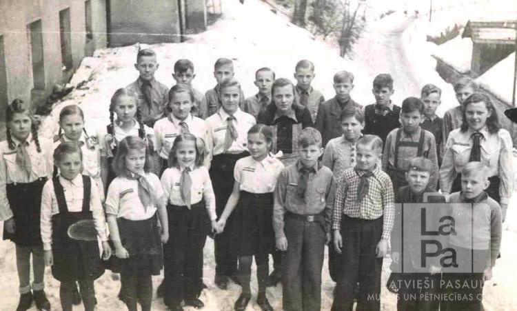 Talsu 103. gaidu un skautu vienības gaidas un skauti stāv sniegā Kurhauzas nometnē Traunšteinā (amerikāņu zonā). Liela daļa bērnu ir ģērbusies formastērpos. Labajā pusē stāv sieviete (vadītāja ?). Kreisajā pusē ir mūra ēka. Fonā apsnigusi ainava – ielas un mājas.