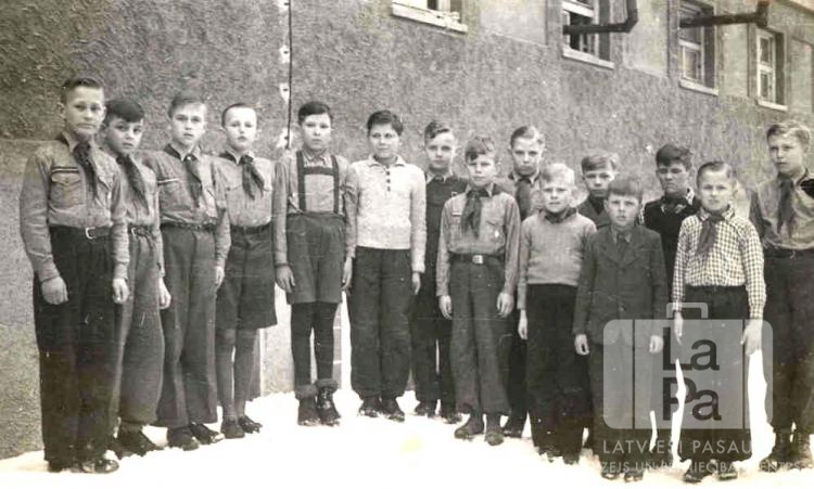 Talsu 103. skautu vienības skauti stāv sniegā Kurhauzas nometnē Traunšteinā (amerikāņu zonā).Daļa zēnu ir ģērbusies skautu formastērpos. Fonā ir mūra ēka; caur diviem logiem ir izvilkti dūmvadi.