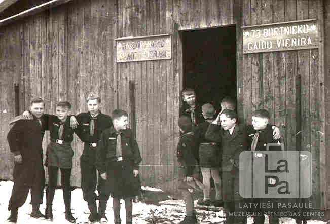 Burtnieku 84. skautu vienības skauti formastērpos stāv pie koka barakas ieejas durvīm – skautu un gaidu mītnes Altetingā (amerikāņu zonā). Abpus ēkas ieejai ir divi uzraksti. Kreisajā pusē uzraksts ir nesalasāms. Labajā pusē ir rakstīts: "73. BURTNIEKU GAIDU VIENĪBA".