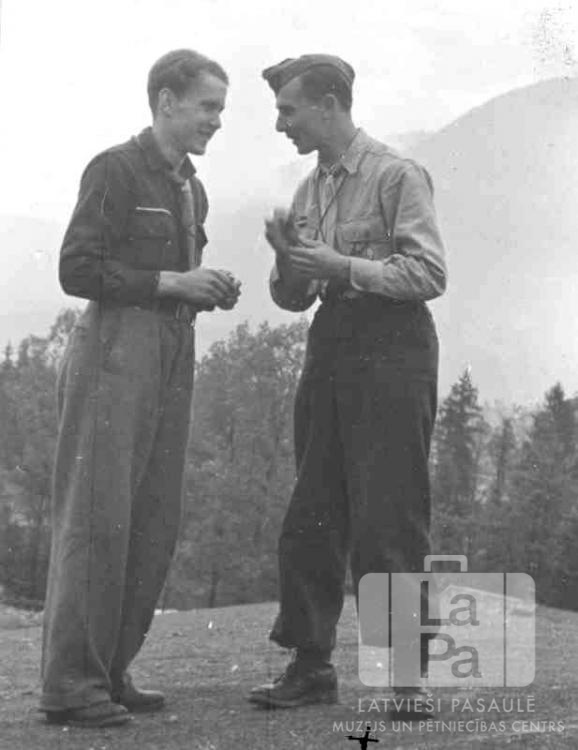 Divi skauti formastērpos no Altetingas nometnes (amerikāņu zonā) stāv uz nogāzes un sarunājas. Fonā mežs un kalnu grēda. No kreisās: nezināms (skautu pulka virskopnieks) un Ivars Bolgzds (Burtnieku 84. skautu vienības priekšnieks).