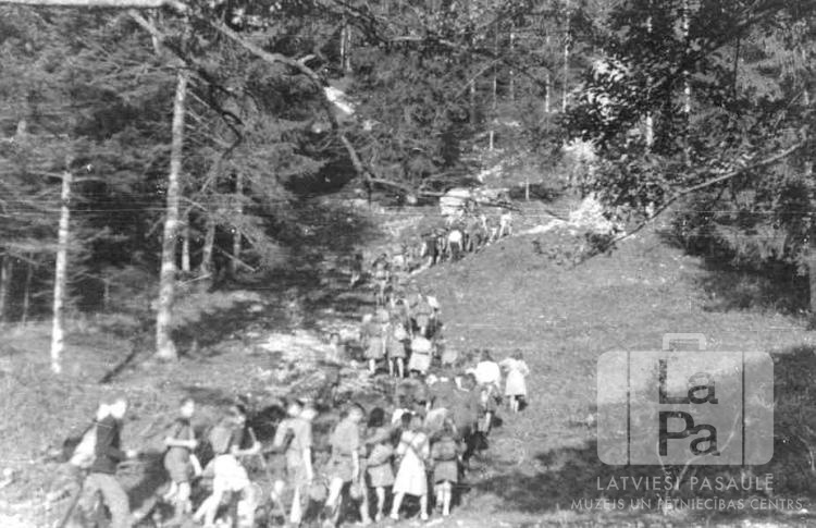 Skauti un gaidas Sidrabenes novada skautu un gaidu kopnieku kursu laikā dodas ceļā uz augstieni pie "Strub" ciemata netālu no Insulas nometnes Berhtesgādenē (amerikāņu zonā) no 1946. gada 16. līdz 18. augustam. Visi formastērpos dodas pa taku augšā kalnā. Apkārt ir mežs.