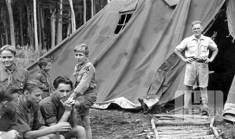 Grupa zēnu skautu formās sēž pie telts, kur stāv vīrietis skautu formā.