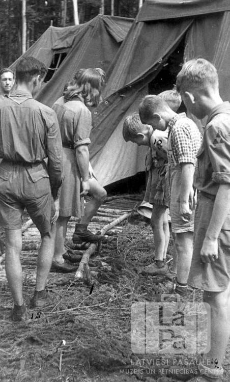 Gaidu vadītāja Mirdza Labsvīra pārbauda Daugmales 51. skautu vienības taisīto tiltu skautu un gaidu nometnē Gautingas mežā pie Minhenes (amerikāņu zonā). Nometne notika no 1946. gada 21. augusta līdz 14. septembrim, un tajā piedalījās arī Daugmales 22. gaidu vienība; abas vienības no Lohengrīnas nometnes Minhenē. Apkārt gaidu vadītājai ir sastājušies skauti; visi ir ģērbušies formastērpos. Fonā divas teltis. Priekšplānā, otrā no kreisās: Mirdza Labsvīra.