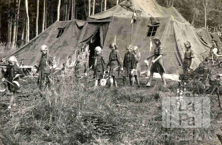 Guntiņas formastērpos ar saviem personīgajiem traukiem rindā dodas uz pusdienām skautu un gaidu nometnē Gautingas mežā pie Minhenes (amerikāņu zonā). Nometne notika no 1946. gada 21. augusta līdz 14. septembrim, un tajā piedalījās Daugmales 51. skautu vienība un Daugmales 22. gaidu vienība; abas vienības no Lohengrīnas nometnes Minhenē. Fonā liela telts.