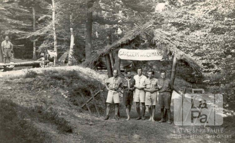 Gilvela skautu kursu vadība formastērpos stāv pie pašdarinātiem koka ieejas vārtiem Garezera kursu nometnē pie Velerodes ciema netālu no Kaseles (amerikāņu zonā). Virs vārtiem ir zīme ar uzrakstu: "GAREZERS in GERMANY". Kreisajā pusē, aiz uzbēruma, stāv vīrietis. Visapkārt mežs. Vīrietis kreisajā pusē: O. Blūms. Pie vārtiem stāv, no kreisās: A. Lūsis, A. Lūks, V. Klētnieks, A. Ķiploks un Hugo Tērauds.