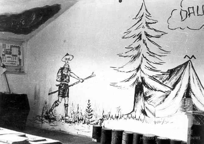 Roveru sienas zīmējums Daugmales 51. skautu vienības un Daugmales 22. gaidu vienības mītnē Freimaņa nometnē Minhenē (amerikāņu zonā) 1947.–1948.gadā. Attēlots skauts ar roveru nūju, soļodams tuvāk eglei, aiz kuras ir uzcelta telts.