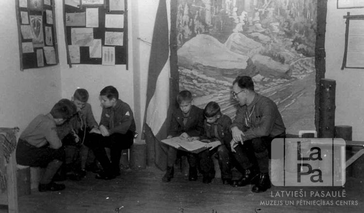 Mazskauti ar vadītāju nodarbību laikā savā stūrī Daugmales 51. skautu vienības un Daugmales 22. gaidu vienības mītnē Freimaņa nometnē Minhenē (amerikāņu zonā) 1947.–1948.gadā. Pie sienas ir Latvijas valsts karogs un Staburaga glezna. No kreisās: Pirmais no labās: Magnus Ezeriņš (vadītājs). Uz zāģētajiem bluķiem ir redzami: J. Alksnis, K. Dakers, J. Spalviņš un E. Kļaviņš.
