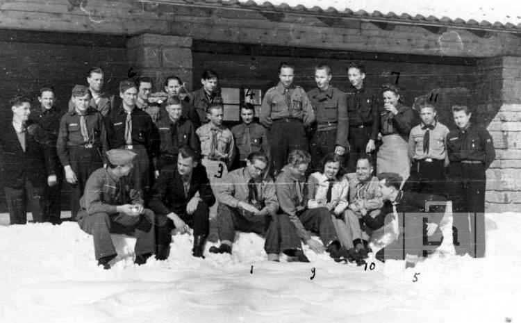 Sidrabenes skautu novada roveri pie ēkas sagaitas laikā Insulas nometnē Berhtesgādenē (amerikāņu zonā). Priekšējā rinda sēž sniegā. Grupā redzami, pēc numuriem: 1. Ž. Grundmanis (vadītājs), 3. V. Virsis (vadītājs), 4. I. Jirgens (rovers), 5. Ivars Bolgzds (vadītājs), 7. M. Virse (vadītāja), 9. Jānis Apsīte (vadītājs), 10. J. Klimovočs (vadītājs) un 11. J. Ûdris (rovers).