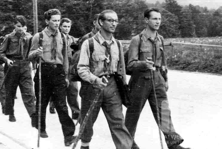 Daugmales 51. skautu vienības roveri no Freimaņa nometnes Minhenē (amerikāņu zonā) pa ceļu dodas uz solījuma došanu "Strub" kalnā. Rokās visiem ir īkšķa nūjas. Fonā ir pļava un mežs. Pirmajā rindā soļo, no kreisās: Ž. Grundmanis (vadītājs) un A. Richters. Pārējā grupā ir redzami: G. Kaušelis, H. Upenieks un U. Cīrulis.