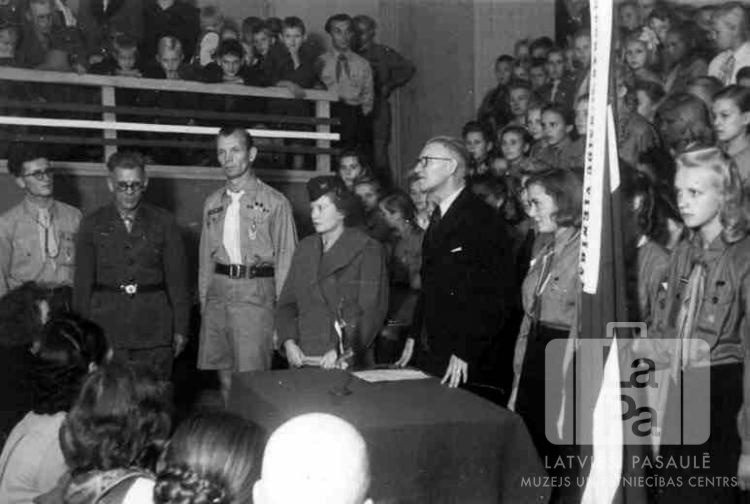 Skrundas 19. skautu vienības un Skrundas 54. gaidu vienības 2 darbības gadu jubilejas svinības teātra mājā Valkas nometnē Nirnbergā (amerikāņu zonā). Vidū ir galds, aiz tā stāv skautu un gaidu vadītāji. Labajā pusē stāv gaida ar Latvijas valsts karogu, aiz viņas tribīnēs stāv citas gaidas. Aizmugurē, kreisajā pusē, uz balkona ir skatītāji. Aiz galda stāv, no kreisās: J. Velde, Kārlis Stunda, A. Grigors, nezināms (organizācijas "IRO" pārstāve), Eduards Dinvalds (vecāku padomes priekšsēdis) un M. Ceriņa.