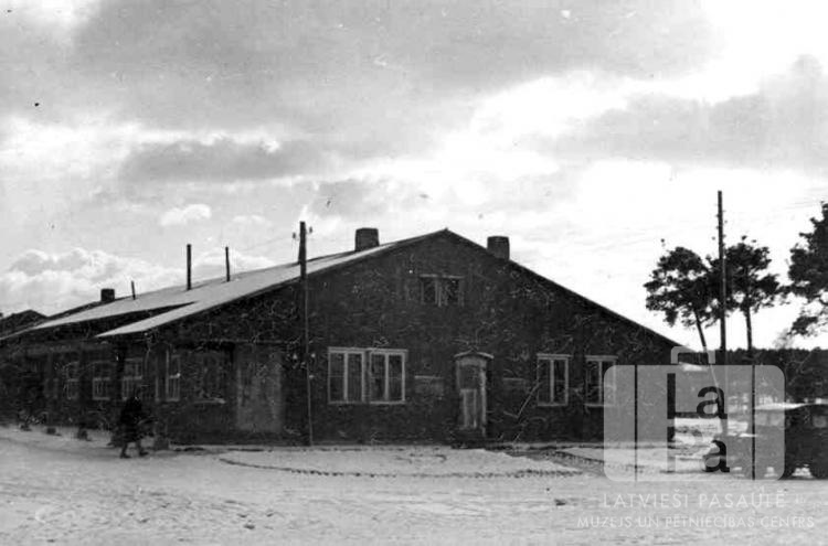 Skautu un gaidu mītnes baraka Valkas nometnē Nirnbergā (amerikāņu zonā) – zema ķieģeļu ēka. Priekšplānā ir apsnigusi zeme. Kreisajā pusē uz ēku dodas cilvēks. Labajā pusē ir automašīna un trīs priedes.