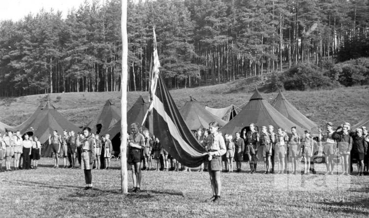 Trīs zēni skautu formās pacēļ Latvijas karogu. Citi zēni skautu formās stāv ierindā un sveic ar skutu sveicienu.