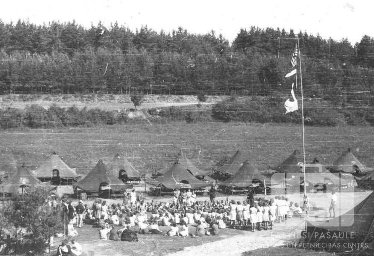 Vecāki piedalās dievkalpojumā rajona mazskautu nometnē Vindsbahā netālu no Ansbahas nometnes (amerikāņu zonā). Cilvēki atrodas laukumā starp teltīm, labajā laukuma pusē ir garš masts ar Latvijas un ASV karogu galā. Fonā pļava un mežs. Nometne notika no 1947. gada 11. līdz 25. augustam. Tajā piedalījās mazskauti no Valkas nometnes (Skrundas 19. skautu vienība), Fišbahas nometnes (Trikātas 49. skautu vienība), Hersbrukas nometnes (Kuldīgas 50. skautu vienība), Rotenburgas nometnes (Ventas 108. skautu vienība), Dinkenbīles nometnes (Staburaga 98. skautu vienība) un Ansbahas nometnes (Lielvārdes 15. skautu vienība).