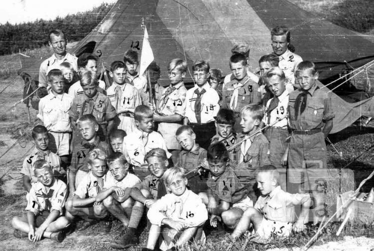 Skrundas 19. mazskautu vienība formastērpos pie telts rajona mazskautu nometnē Vindsbahā netālu no Ansbahas nometnes (amerikāņu zonā). Fonā mežs. Nometne notika no 1947. gada 11. līdz 25. augustam. Tajā piedalījās mazskauti no Valkas nometnes (Skrundas 19. skautu vienība), Fišbahas nometnes (Trikātas 49. skautu vienība), Hersbrukas nometnes (Kuldīgas 50. skautu vienība), Rotenburgas nometnes (Ventas 108. skautu vienība), Dinkenbīles nometnes (Staburaga 98. skautu vienība) un Ansbahas nometnes (Lielvārdes 15. skautu vienība). Grupā redzami (pēc numuriem): 1. A. Grigors (vadītājs), 2. E. Grigora (vadītāja), 3. Kārlis Stunda (vadītājs), 4. ? Circenis, 5. G. Puriņš, 6. J. Bāliņš, 7. A. Lubovs, 8. J. Bērziņš, 9. V. Liepa, 10. V. Benders, 11. O. Matīss, 12. I. Zariņš, 13. N. Leimanis, 14. I. Ādamsons, 15. Z. Tifantāls, 16. I. Kārkls, 17. M. Venners, 18. A. Grīnbergs, 19. J. Karps, 20. G. Bērziņš, 21. R. Albertiņš, 25. I. Grīviņš.