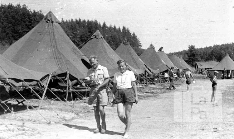 Skautu vadītāji apskata rajona mazskautu nometni Vindsbahā netālu no Ansbahas nometnes (amerikāņu zonā). Aizmugurē telšu rinda un vairāki zēni. Aiz teltīm mežs. Nometne notika no 1947. gada 11. līdz 25. augustam. Tajā piedalījās mazskauti no Valkas nometnes (Skrundas 19. skautu vienība), Fišbahas nometnes (Trikātas 49. skautu vienība), Hersbrukas nometnes (Kuldīgas 50. skautu vienība), Rotenburgas nometnes (Ventas 108. skautu vienība), Dinkenbīles nometnes (Staburaga 98. skautu vienība) un Ansbahas nometnes (Lielvārdes 15. skautu vienība). Priekšplānā vadītāji, no kreisās: Kārlis Stunda un E. Grigora.