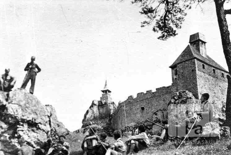 Skrundas 19. skautu vienība no Valkas nometnes Nirnbergā (amerikāņu zonā) sirojumā pie Hohenšteinas pils ziemeļos no Hersbrukas. Divi zēni stāv kreisajā pusē uz klints, lielākā daļa sēž uz nogāzes. Rokās vairākiem zēniem ir nūjas. Visi ir ģērbušies skautu formastērpos. Fonā pils ar augstu mūri un diviem torņiem.