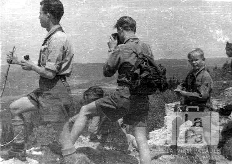 Skrundas 19. mazskautu vienība no Valkas nometnes Nirnbergā (amerikāņu zonā) apmeklēja Rotenburgas pili. Zēni un vadītājs ir ģērbušies skautu formastērpos. Vienam vīrietim rokās ir nūja un binoklis, viens skauts fotografē ainavu. Fonā mežiem apaugusi nogāze un skats uz ieleju. No kreisās (stāv): pirmais H. Hazners (vadītājs), otrais Leons Liepa (skauts) un trešais Jānis Karps (mazskauts).