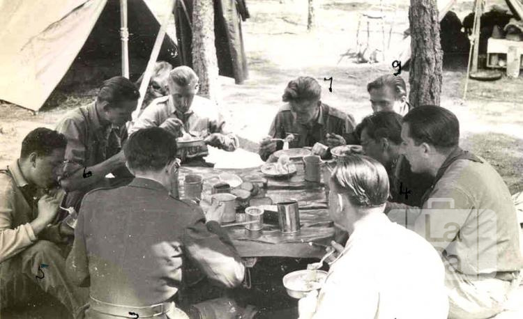 Skauti formastērpos sēž pie apaļa pusdienu galda skautu un gaidu vadītāju sagatavošanas kursos mežā pie Fišbahas nometnes (amerikāņu zonā). Kursi notika no 1949. gada 13. līdz 19. jūnijam. Uz galda ir ēdienu trauki. Fonā telts un priežu stumbri. Grupā redzami (pēc numuriem): piektais A. Reske, sestais Fr. Liepiņš, septītais G. Bieķēns un devītais J. Kažociņš.