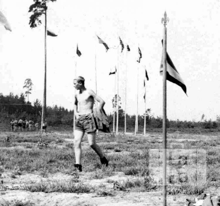 Zēns staigā pa pļavu Otrās starptautiskās pārvietoto personu skautu nometnes laikā pie Fišbahas nometnes (amerikāņu zonā). Nometnē piedalījās latviešu, amerikāņu, lietuviešu, igauņu, angļu, vācu, ukraiņu, krievu un ungāru skauti. Aiz zēna mastos ir redzami pārstāvēto valstu karogi. Nometne notika no 1949. gada 19. līdz 29. augustam. Fonā, kreisajā pusē, ir neliela skautu grupa. Visapkārt ir mežs.