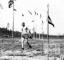 Zēns pie valstu karogiem Otrajā starptautiskajā skautu nometnē
