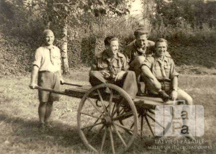 Novada priekšnieks vadītājs Pēteris Vīlips stumj ratus ar Baltezera 63. skautu vienības vadītājiem Lielupes skautu novada vadītāju nometnē Bad-Vorishofenā netālu no Memmingenes nometnes (amerikāņu zonā). Visi ir ģērbušies skautu formastērpos. Nometne notika 1947. gada 23. un 24. augustā. Fonā ir augsts dzīvžogs. Pirmais no kreisās: Pēteris Vīlips.