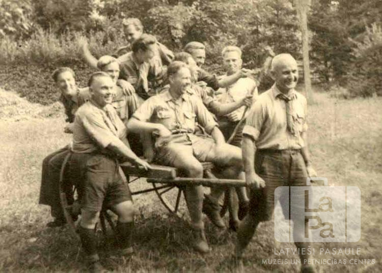Novada priekšnieks vadītājs Pēteris Vīlips velk ratus ar skautu vadītājiem Lielupes skautu novada vadītāju nometnē Bad-Vorishofenā netālu no Memmingenes nometnes (amerikāņu zonā). Visi ir ģērbušies skautu formastērpos. Nometne notika 1947. gada 23. un 24. augustā. Fonā ir augsts dzīvžogs un mežs. Pirmais no labās: Pēteris Vīlips.