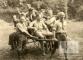 Vīrieši skautu formās sēž ratos. Viens velk ratus.