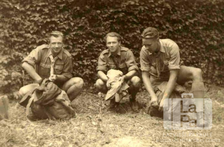 Trīs skautu vadītāji ar mantām Lielupes skautu novada vadītāju nometnē Bad-Vorishofenā netālu no Memmingenes nometnes (amerikāņu zonā). Visi ir ģērbušies skautu formastērpos. Nometne notika 1947. gada 23. un 24. augustā. Fonā ir dzīvžogs.