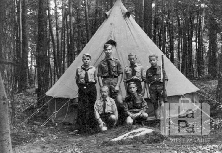 Spilves 42. skautu vienības skauti no Hānavas nometnes (amerikāņu zonā) pie savas telts meža nometnē 1947. gada vasarā. Visi ir ģērbušies formastērpos. Aizmugurē, otrais no kreisās: A. Pladars (kopnieks, ar cepuri).