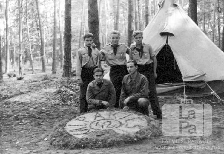 Spilves 42. skautu vienības roveru Kalpaka saime no Hānavas nometnes (amerikāņu zonā) pie savas telts meža nometnē 1947. gada vasarā. Visi ir ģērbušies formastērpos. Priekšplānā uz zemes ir nosaukums "KALPAKIEŠI 42".