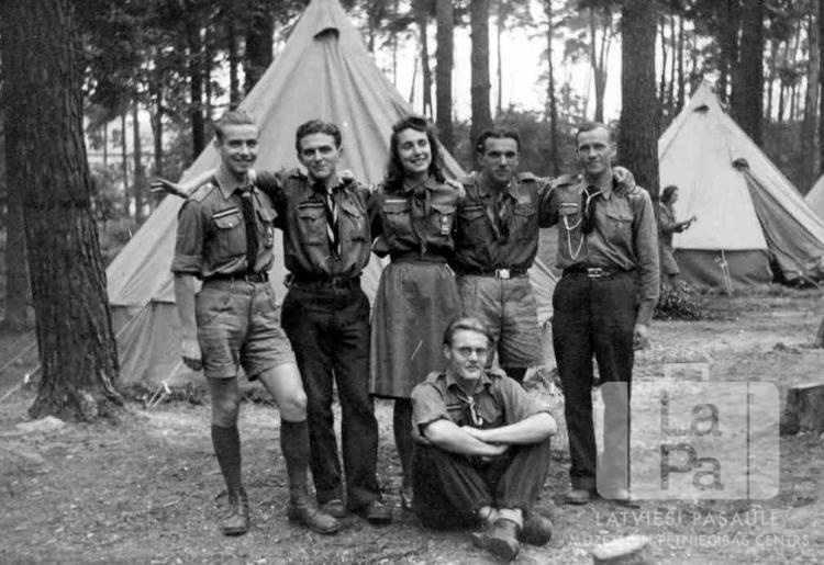 Spilves 42. skautu vienības roveri un Skrundas 7. gaidu vienības lielgaida no Hānavas nometnes (amerikāņu zonā) pie savas telts meža nometnē 1947. gada vasarā. Visi ir ģērbušies formastērpos. Fonā ir vairākas uzslietas teltis. Otrais no kreisās: Juris Bērziņš.