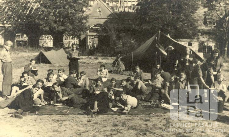 Spilves 42. skautu un Skrundas 7. gaidu vienību dalībnieki bauda kopējas pusdienas skautu dienas svinībās Hānavas nometnē (amerikāņu zonā). Skauti un gaidas sēž un ēd uz izklāta auduma. Fonā divas teltis, aiz tām ir ēkas karkass.