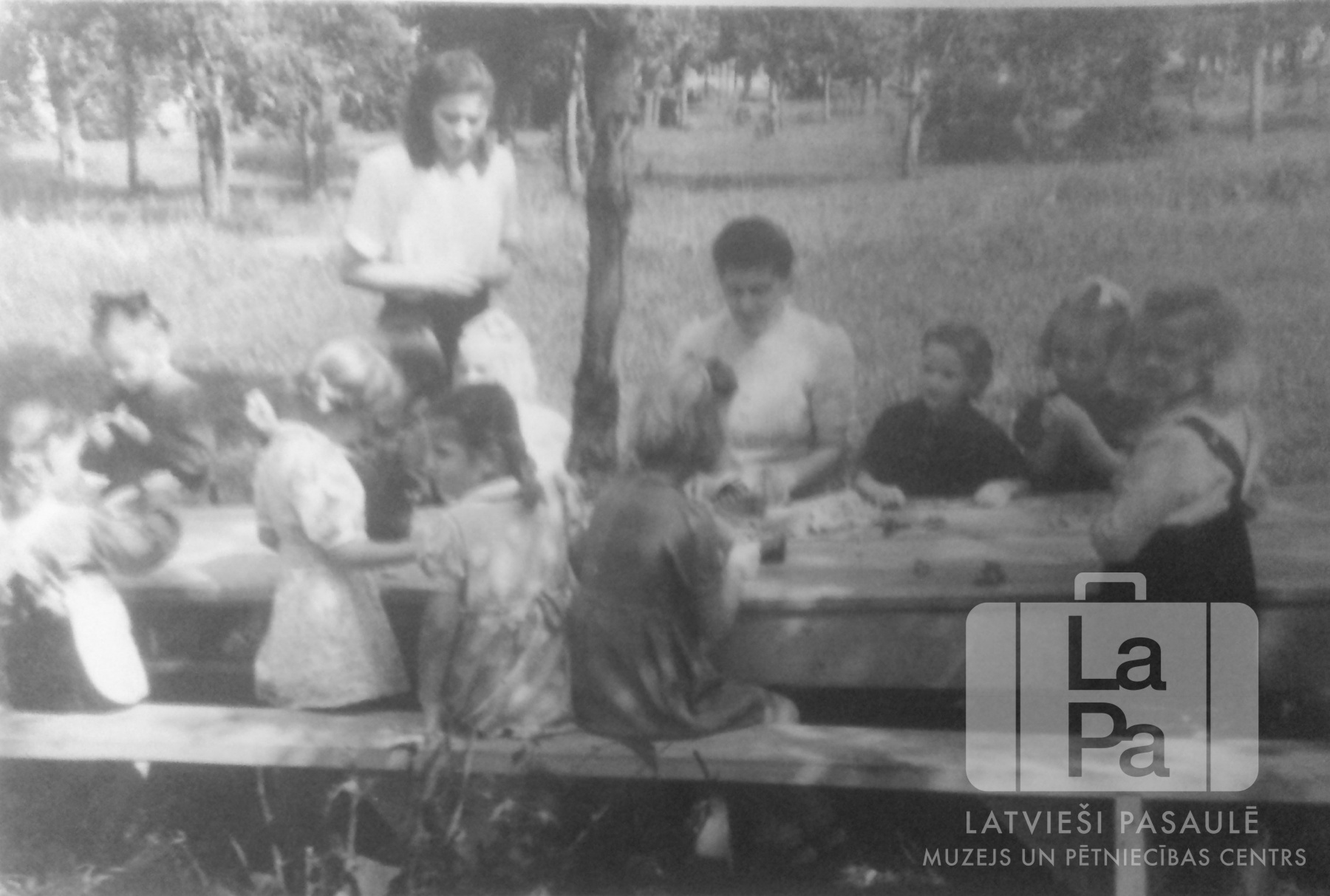 Sieviešu un mazu meiteņu grupa sēž pie gara galda ārā, Memmingenes nometnē (amerikāņu zonā). Fonā ir pļava un mežs. Grupā ir arī Dagnija (Ann) Gailis.
