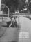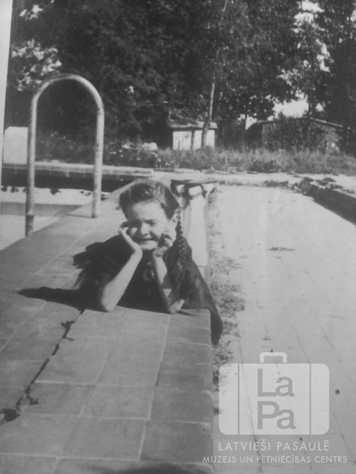 Dagnija (Ann) Gailis bērnībā pie peldbaseina Memmingenē (amerikāņu zonā) ap 1947. gadu. Meitene guļ uz vēdera uz baseina malas. Fonā ir vairākas zemas vienstāvu ēkas starp kokiem.