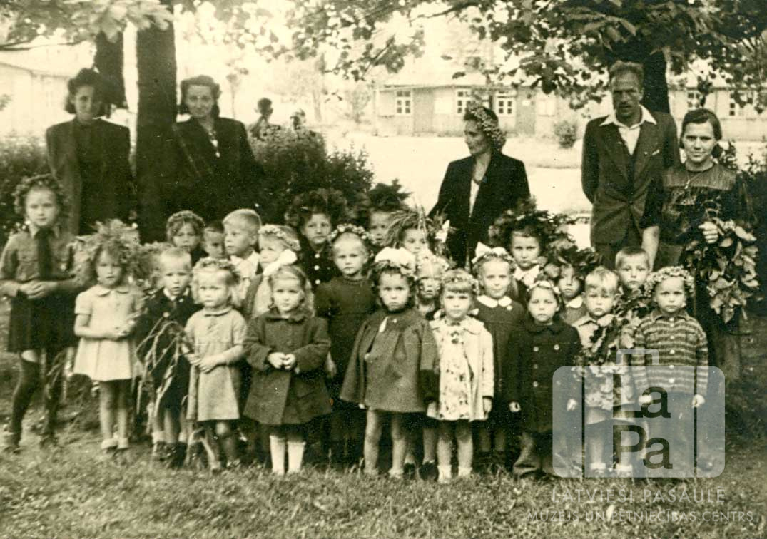 Latviešu bērnudārza bērni un audzinātāji Jāņu dienā stāv zem kokiem Melles nometnē (angļu zonā). Daudziem bērniem galvās ir Jāņu vainagi. Fonā ir laukums un vairākas ēkas. Pirmā no labās puses: Elza Nogoboda (ar ozollapu vainagu uz rokas). Otrajā rindā, trešā no labās puses: Olita Nogoboda (ar balto matu šleipi).