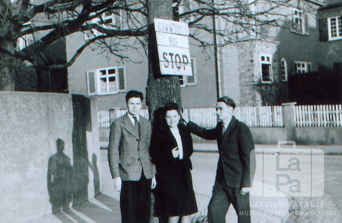 Trīs cilvēki stāv pie koka uz ielas blakus Eslingenes nometnei (amerikāņu zonā). Uz koka ir piestiprināta zīme "COMMODITY/ BUS/ STOP." Kreisajā pusē ir augsta siena, aiz tās ir koks. Fonā, pāri ielai, ir vairākstāvu mūra ēka ar gaišu žogu. No kreisās: Konstantīns Sventeckis, B. Sventecka un J. Lelis.