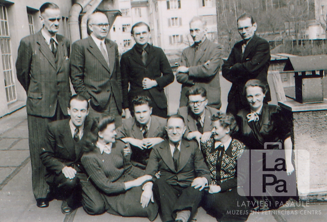 Pārvaldes darbinieki Eslingenes nometnē (amerikāņu zonā). Priekšējā cilvēki sēž uz zemes, aizmugurē stāv kājās. Pa labi ir skurstenis, apkārt vairākas ēkas. Priekšā, no kreisās: A. Baumanis, A. Kaugure, Konstantīns Sventeckis, B. Strujevičs, H. Ritums, M. Bērziņa un I. Ose. Aizmugurē stāv, no kreisās: A. Milenbachs, J. Celms, O. Tolis, V. Kaminskis un nezināms.