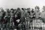 Futbola komanda Eslingenes nometnē (amerikāņu zonā) pirms sacensībām. Vīrieši sporta tērpos stāv rindā. Trešais no kreisās puses ir notupies uz viena ceļa, kājās viņam ir kājsargi, rokās – futbola bumba.